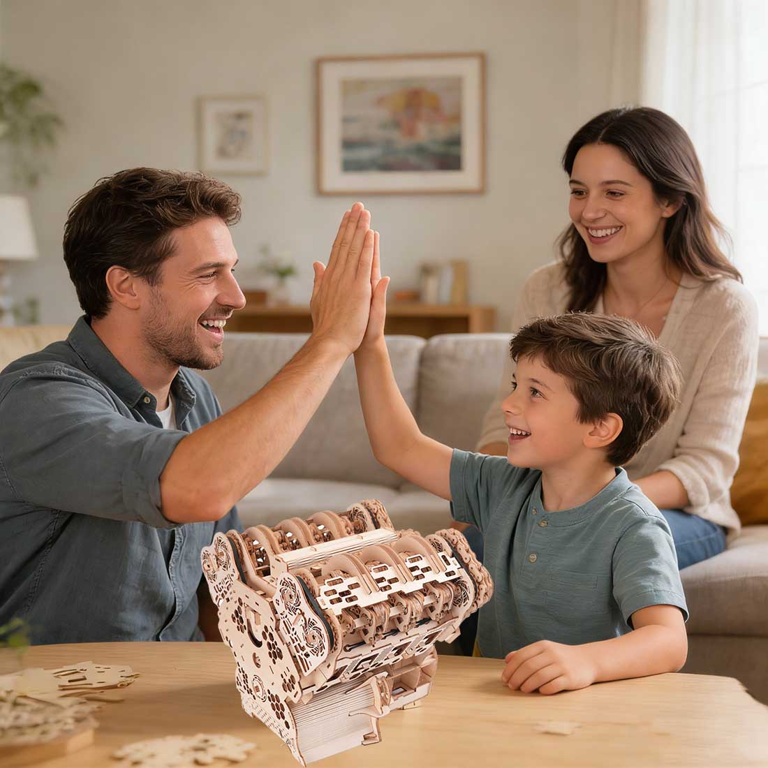.Full Wooden Transmission System: Precision-cut wooden gears and connecting rods create synchronized crankshaft-to-piston movement, accurately reflecting real engine kinematics while delivering both visual impact and mechanical insight.