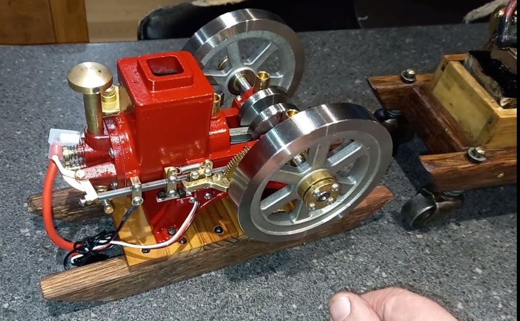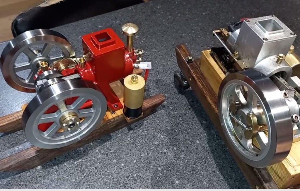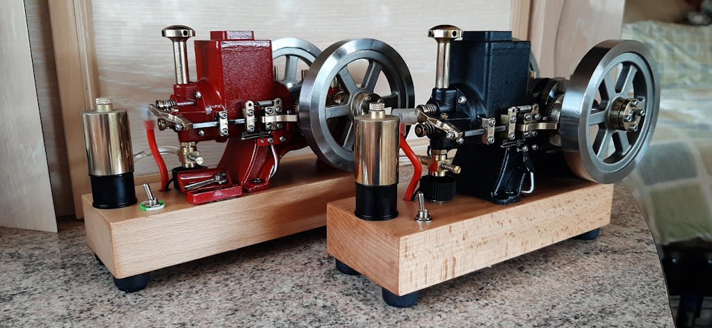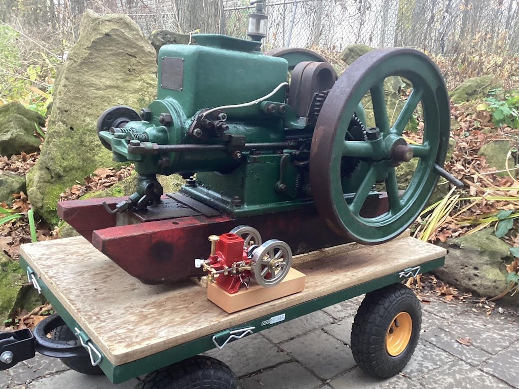 These little engines are terrific! I have several, the red Enjomor being my first. These little mechanical marvels inspired me to purchase a full sized Hit&Miss. Pictured here is my 1.5hp, 300 pound, 100+ year old Alpha Delaval Hit&Miss next its progeny.