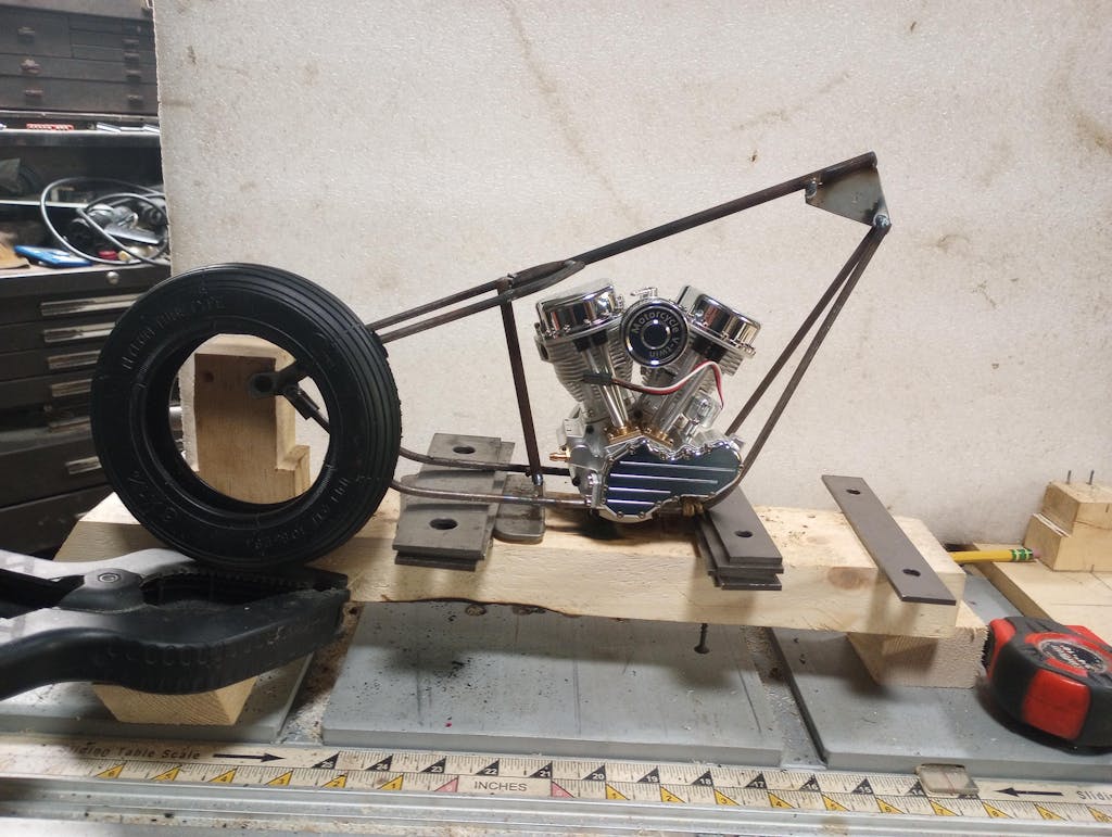Motor looks beautiful I am building a frame got tires making rims, spokes will be fun. Motor is mounted, will be mounted on a wood base when done to show off how it runs. Desk display for all to see. 3D printing fenders hand Making gas tank out of metal.