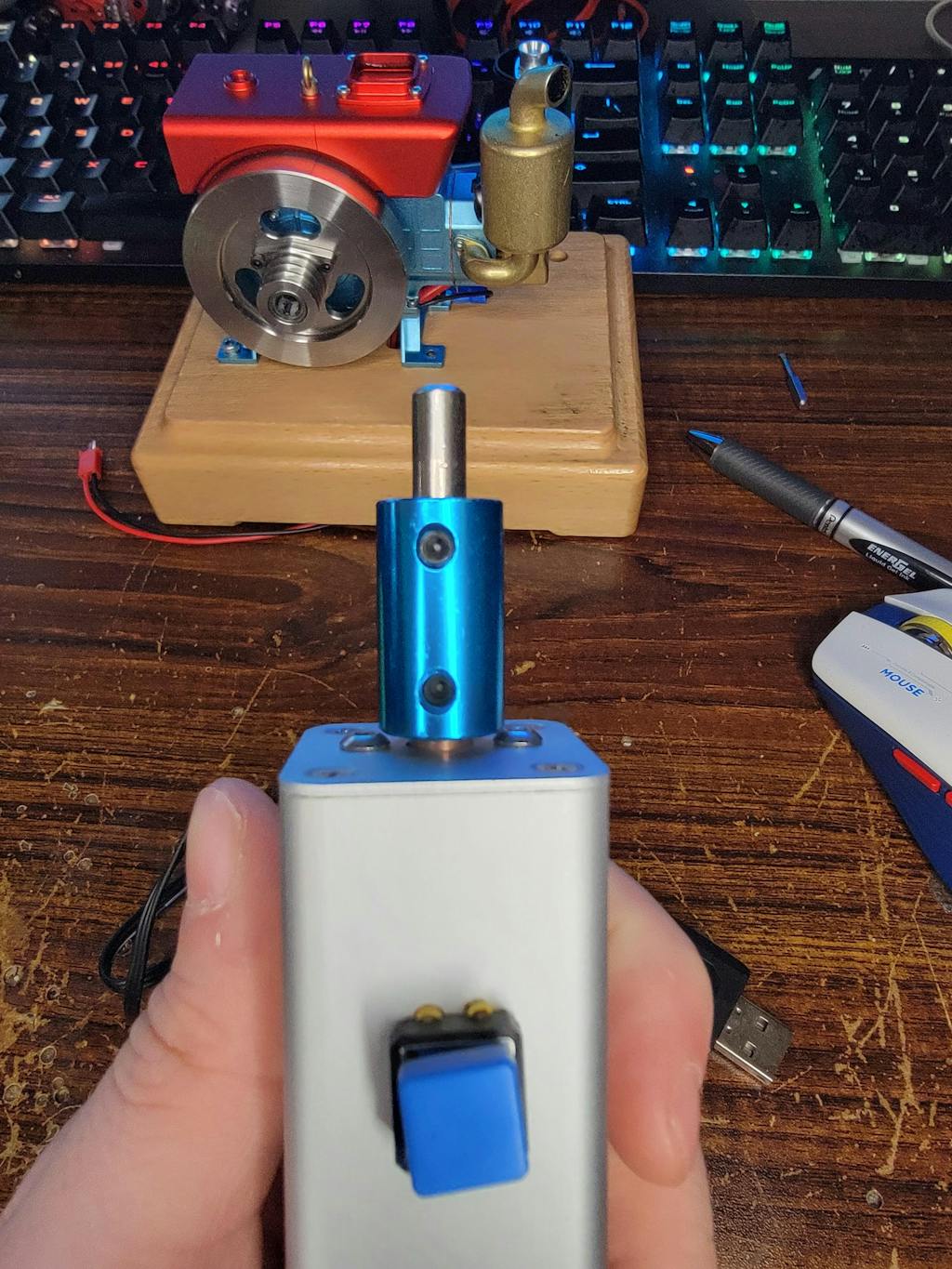 No instructions needed, charge when you need to. And conveniently start any wood base mounted engine with ease. It starts my M16, R29, Retrol tractor engine, and my hoglet. And all in a package no bigger than the wood base these engines sit on. Without the bit its actually shorter.