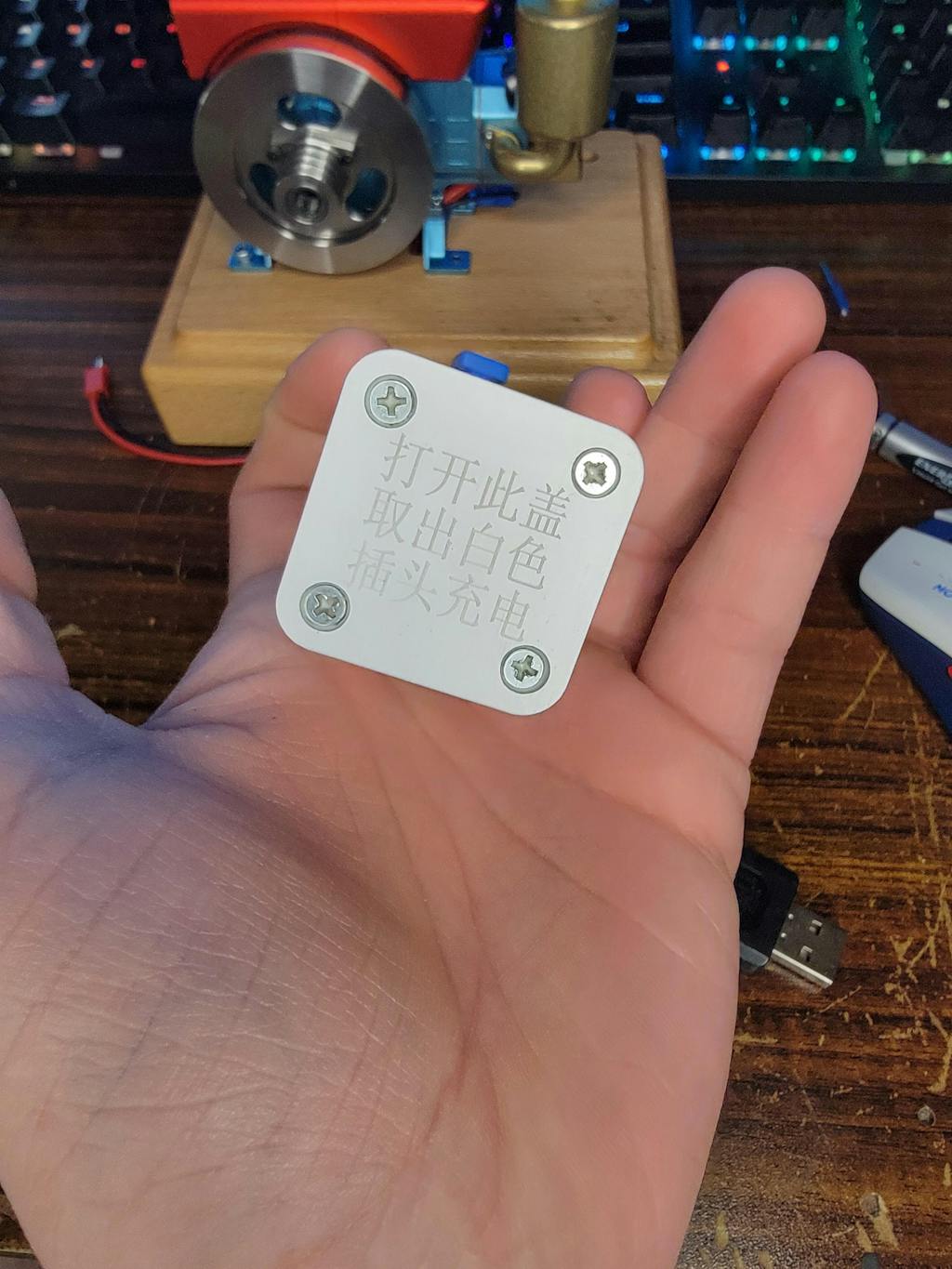 It comes with a charging cable of course, the 4 screws on the back reveal the battery and cable.