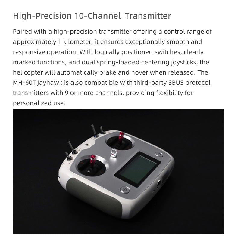 .True-to-Life UH-60 Black Hawk Military Design: Modeled after the iconic UH-60 helicopter, this 470-class scale RC model features a fully detailed fuselage, quick-release rotor blades, and a 6-channel setup that captures the authentic look and flight characteristics of the real aircraft.