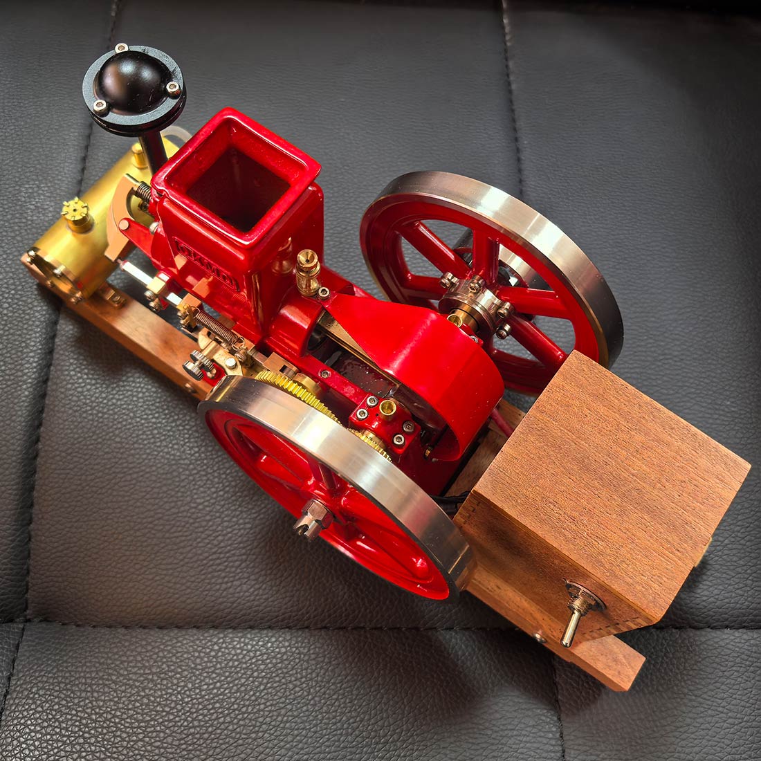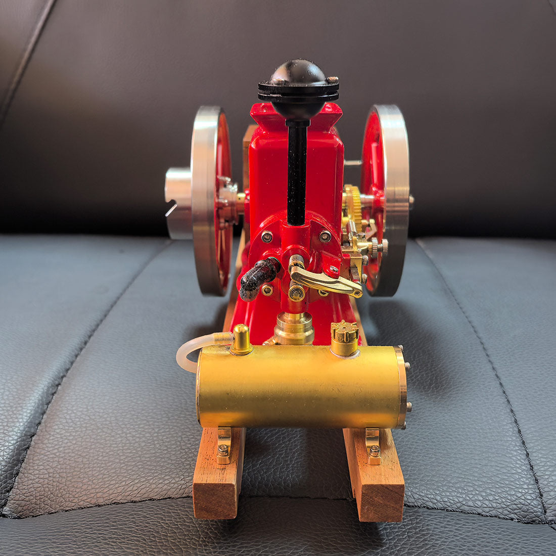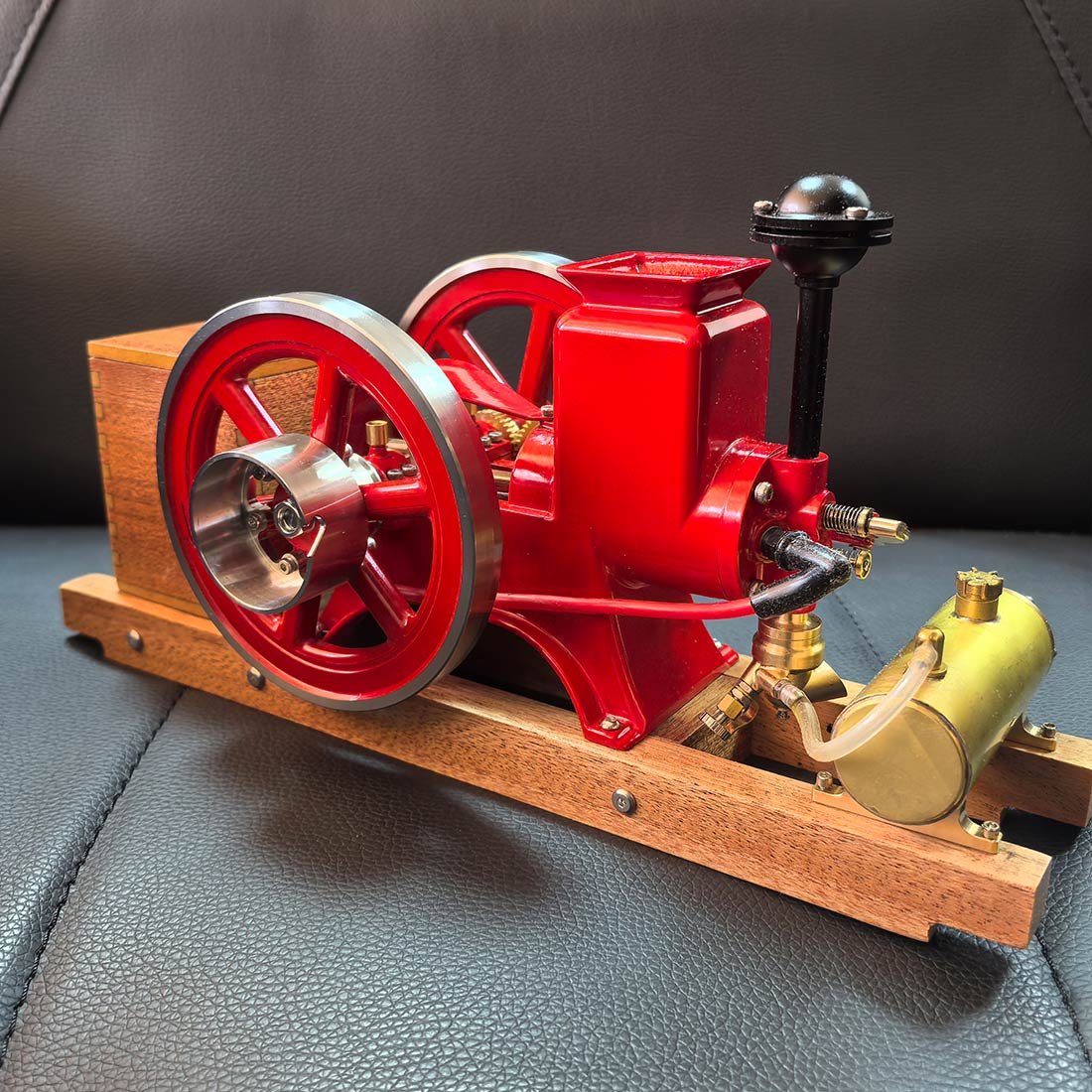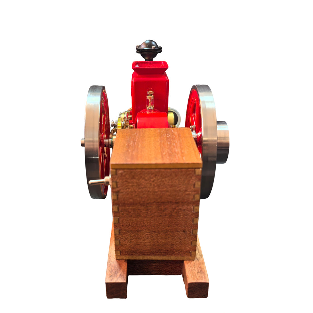 .Early Agricultural Powertrain Reference: Built at approximately 1/4 scale, this horizontal engine recreates the structural characteristics of early 20th-century agricultural power units. The exposed flywheel and intermittent ignition reflect the operational logic used before widespread electrification. .Ready-to-Run Mechanical Configuration: Delivered in RTR form, the engine features a mechanical ignition system and supports manual or electric drill starting. A solid wooden base provides operational stability, allowing the running cycle of a four-stroke engine to be observed within minutes. .Precision Metal Engineering with Authentic Mass: Constructed primarily from machined metal components, the model conveys realistic weight, surface texture, and mechanical feedback. The vintage red finish highlights classic industrial aesthetics while helping reduce surface oxidation during repeated operation or display. .Display-Oriented Mechanical Centerpiece: Suitable for placement in studies, workshops, offices, or display cabinets, the engine presents both visual presence and functional interest. Its operating motion and exposed mechanisms naturally draw attention and invite discussion. .Mechanical Observation and Knowledge Exploration: The intermittent firing cycle provides a clear view of early internal combustion logic, making the engine a tangible reference for understanding mechanical timing, power transmission, and historical engine design principles.