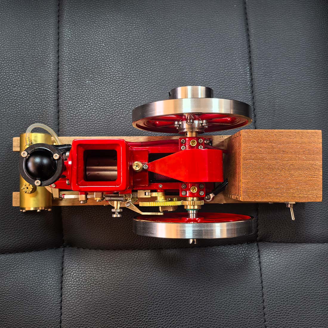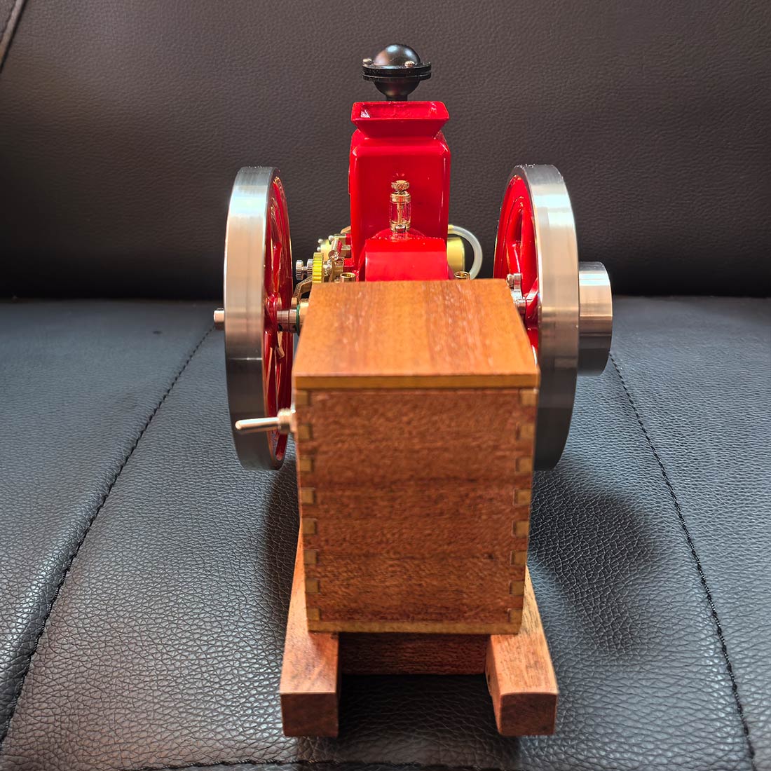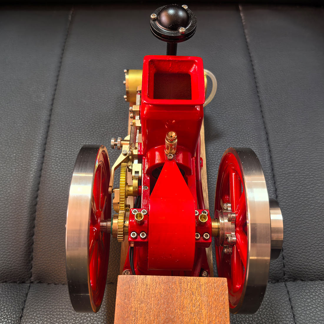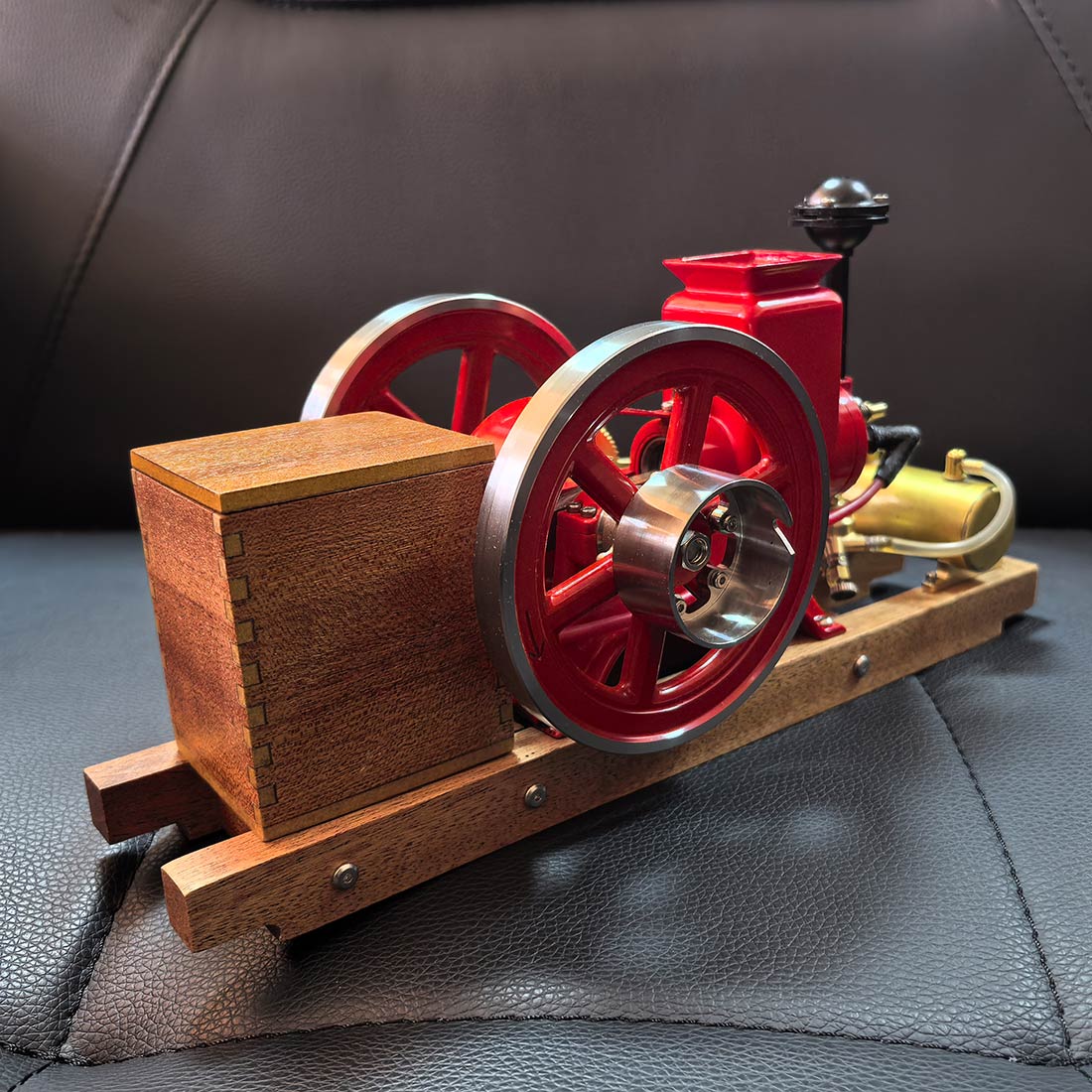 .Early Agricultural Powertrain Reference: Built at approximately 1/4 scale, this horizontal engine recreates the structural characteristics of early 20th-century agricultural power units. The exposed flywheel and intermittent ignition reflect the operational logic used before widespread electrification. .Ready-to-Run Mechanical Configuration: Delivered in RTR form, the engine features a mechanical ignition system and supports manual or electric drill starting. A solid wooden base provides operational stability, allowing the running cycle of a four-stroke engine to be observed within minutes. .Precision Metal Engineering with Authentic Mass: Constructed primarily from machined metal components, the model conveys realistic weight, surface texture, and mechanical feedback. The vintage red finish highlights classic industrial aesthetics while helping reduce surface oxidation during repeated operation or display. .Display-Oriented Mechanical Centerpiece: Suitable for placement in studies, workshops, offices, or display cabinets, the engine presents both visual presence and functional interest. Its operating motion and exposed mechanisms naturally draw attention and invite discussion. .Mechanical Observation and Knowledge Exploration: The intermittent firing cycle provides a clear view of early internal combustion logic, making the engine a tangible reference for understanding mechanical timing, power transmission, and historical engine design principles.