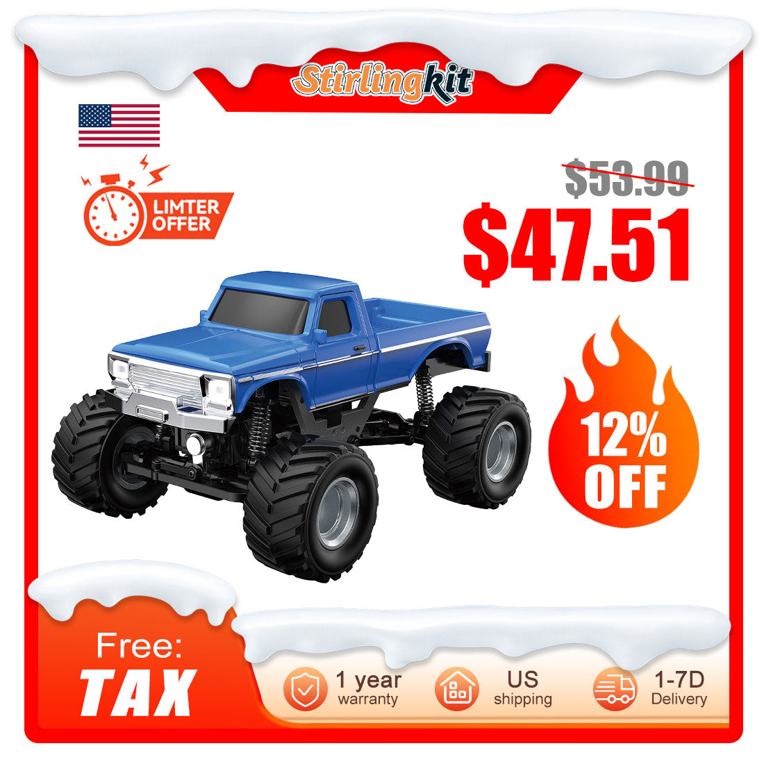 Don’t let its size fool you — this tiny monster truck packs a punch! Built tough with metal frame rails, a four-link suspension, and fully proportional control, it’s perfect for desktop crawling, backyard fun, or just showing off on your shelf. Whether you’re a serious RC fan or just want something fun to race during your lunch break, this 1/36 scale F150-style monster truck delivers surprisingly impressive performance and tons of fun.