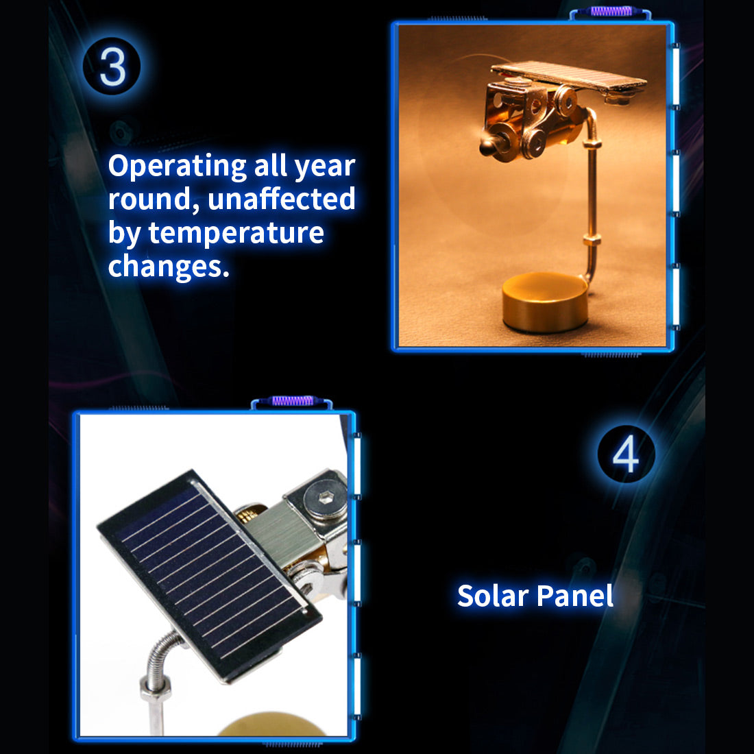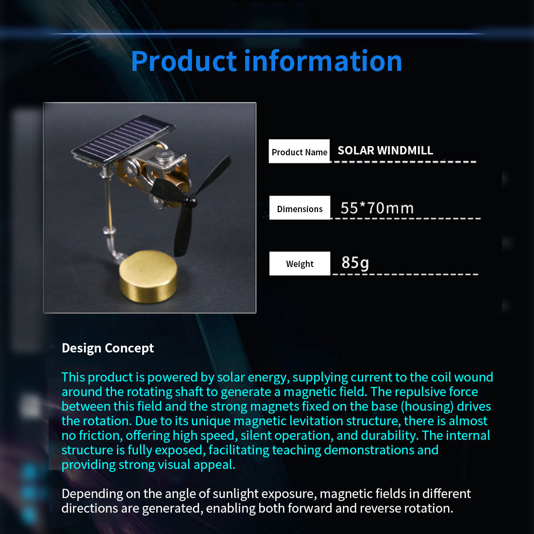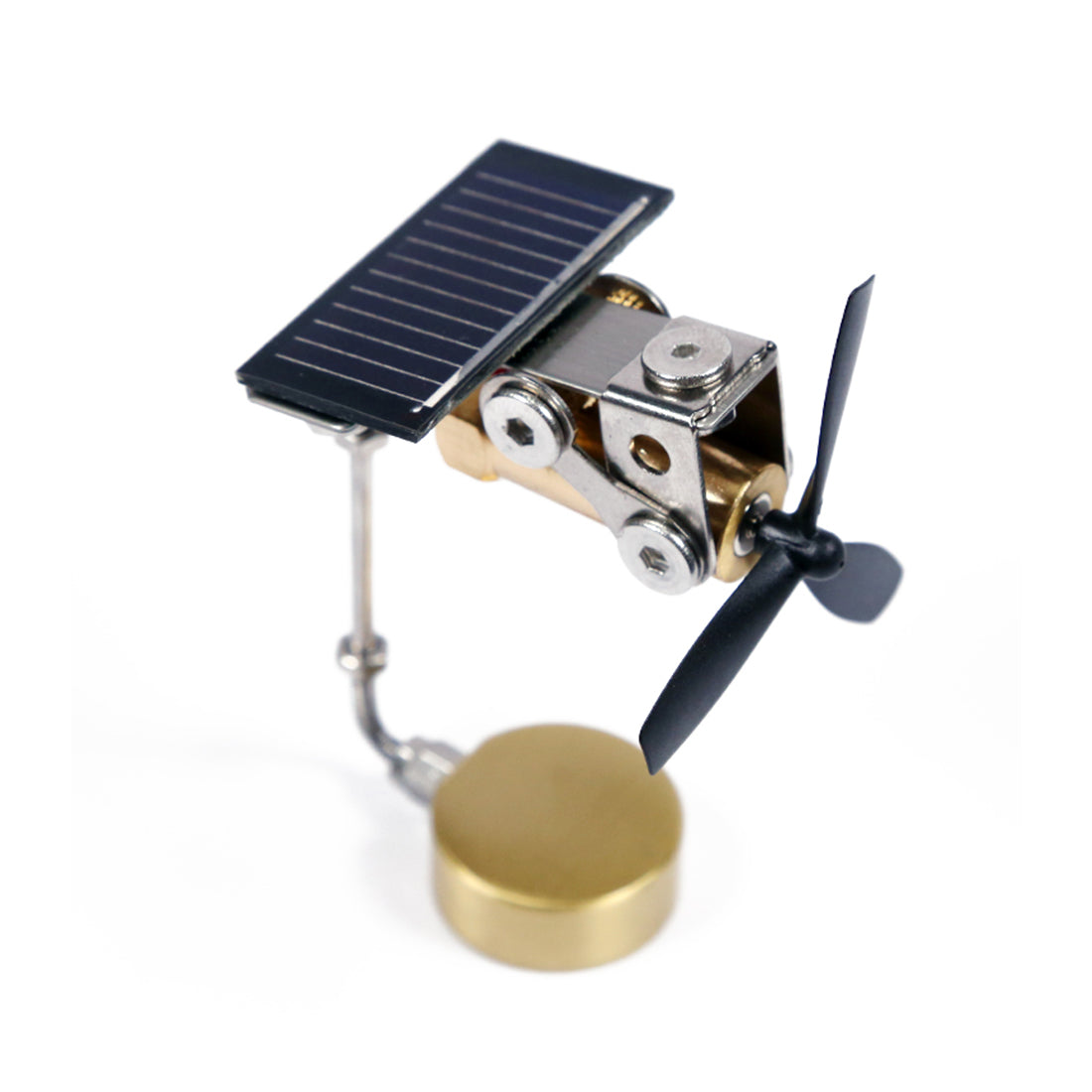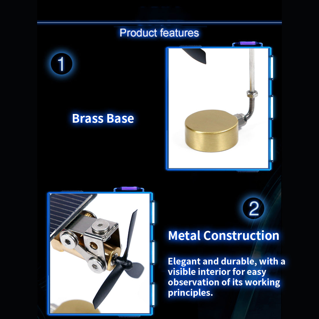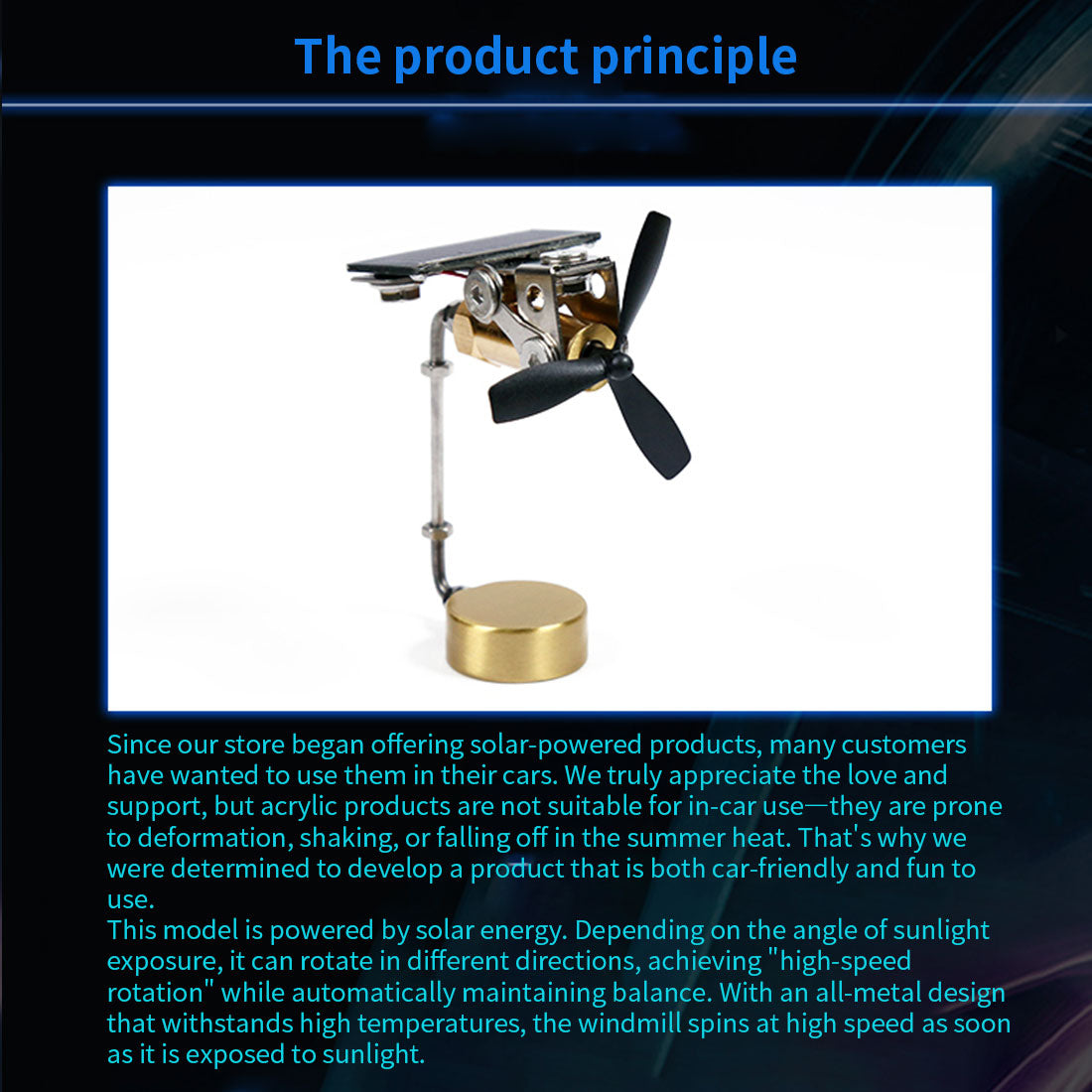 .Creative Technology Ornaments: Solar powered windmill motor model, and the base come with car glue, which can be used for car-mounted. The inside is clearly visible, which makes it easy to observe the principle. It is not affected by temperature changes and can be rotated throughout the year. Polysilicon solar panels. Made of metal, beautiful and durable.