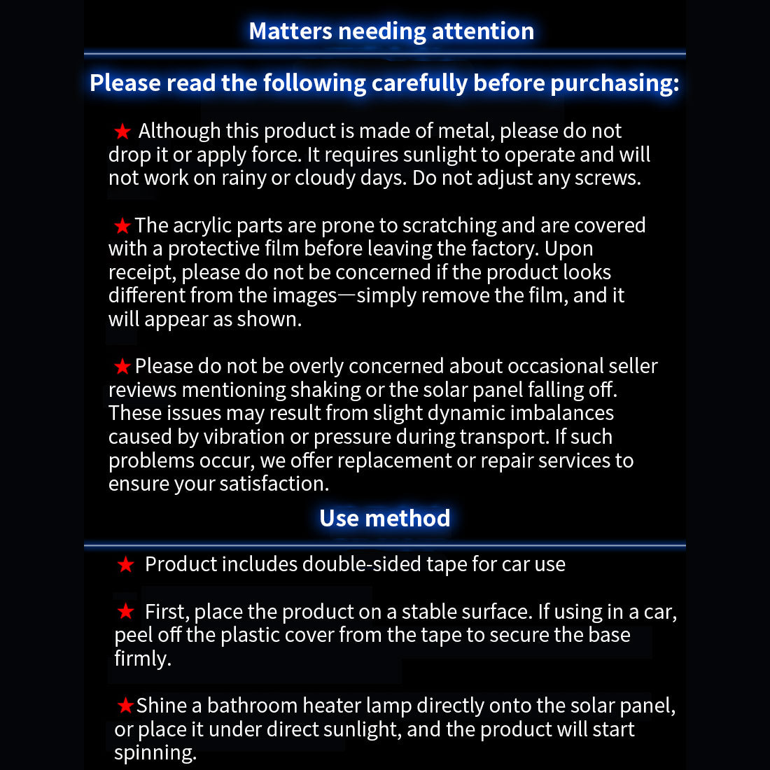 .Note: Although it is a metal product, please do not drop it forcefully, and do not move any screws. The product needs to be turned in the sun. It cannot be turned on a rainy or cloudy day. Acrylic is easy to grind and will be shipped with a film; due to the imperfect dynamic balance caused by the shaking or squeezing of the product during transportation, we will provide replacement or repair services to solve this problem.