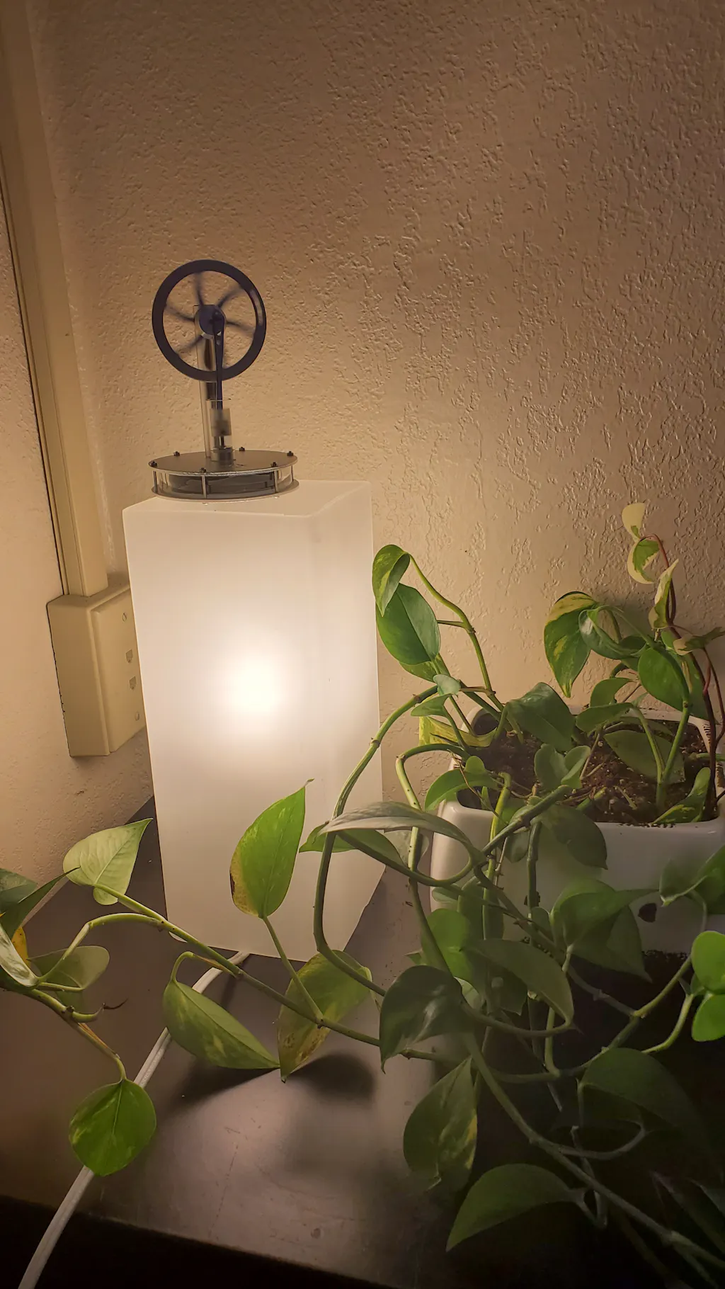 Have it on a coffee warmer with coins stacked on it to raise the engine to slow the engine down. Works continually and is fun to watch.