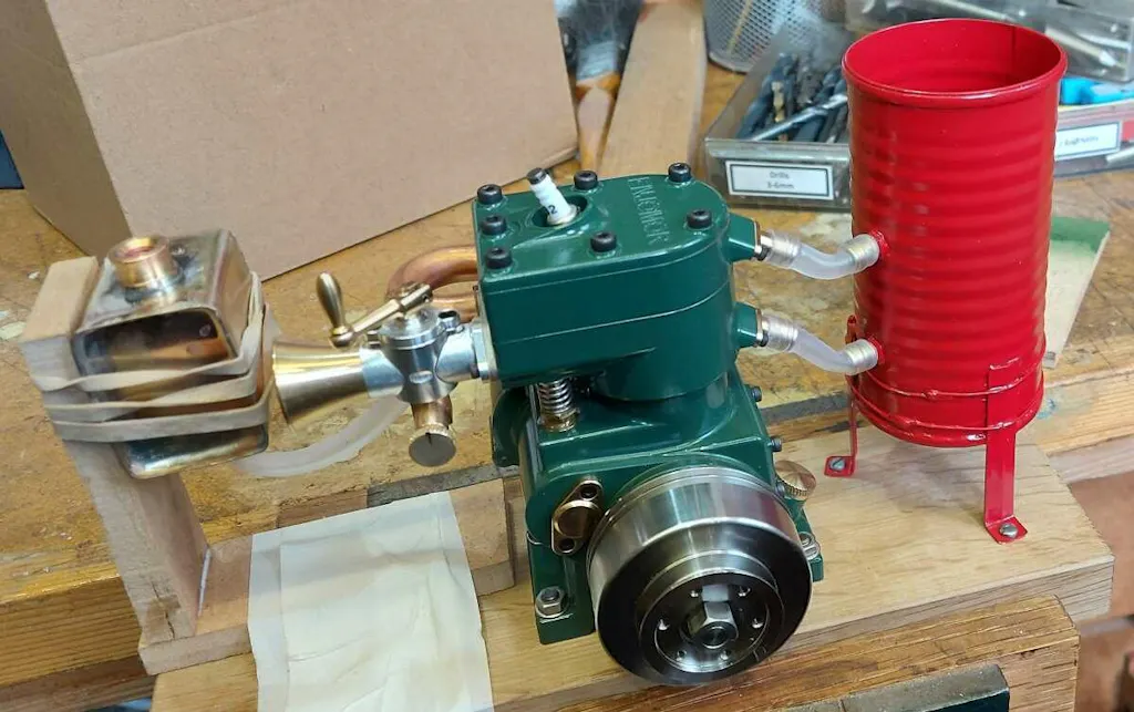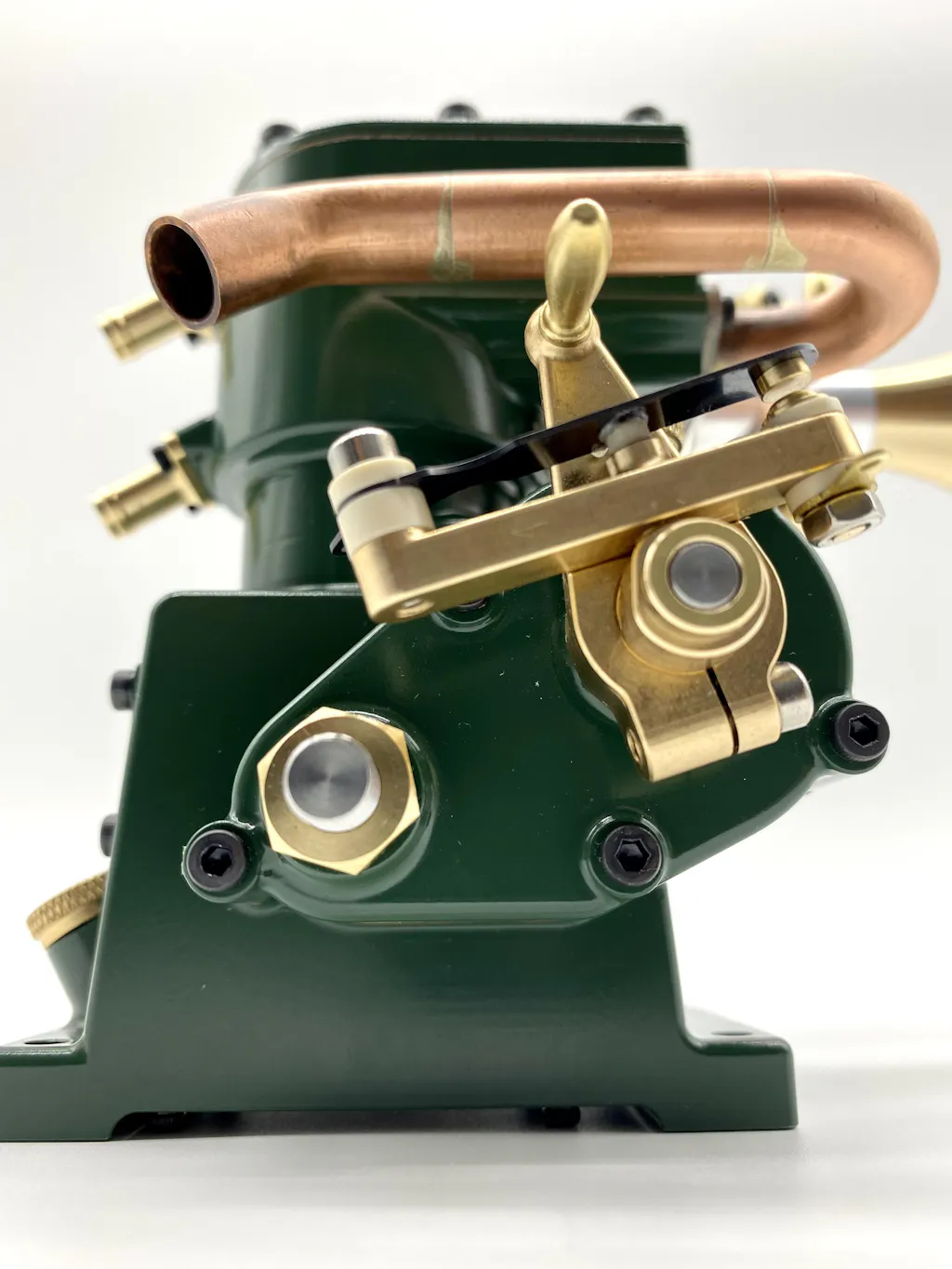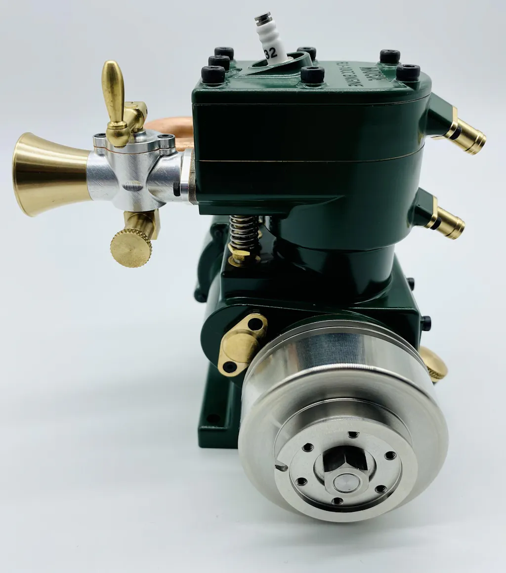 Stirlingkit & Enjomor have added a lot of extra details that really make it stand out, such as the small brass water inlet & outlet flanges, the velocity stack, small machining details such as the vented oil cap on the ignition side, a clever retaining plate for securing the exhaust, copper carb & exhaust gaskets, & the little brass lever on the throttle & points adjustment are just too cool.
